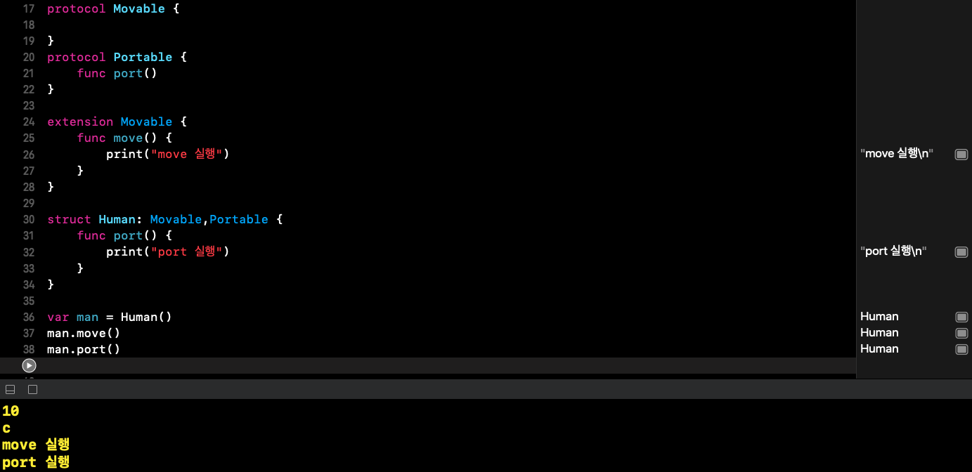 프로토콜에 extension을 이용하면 구현부분을 작성할 수 있습니다.
