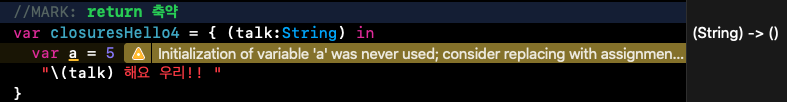 return 없이 바로 "\(talk) 해요 우리!! " 이 부분이 보이시나요?