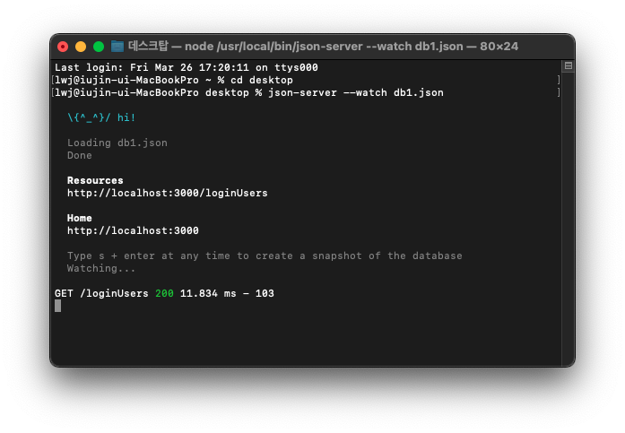 4. 터미널에서 cd desktop 명령를 입력 후 데스크탑 위치 이동 후 db1.json 로컬 파일을 실행시켜줍니다.