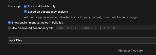 "For install Builds only" 체크 시 Archive를 만들때에만 스크립트 내용이 실행됩니다.