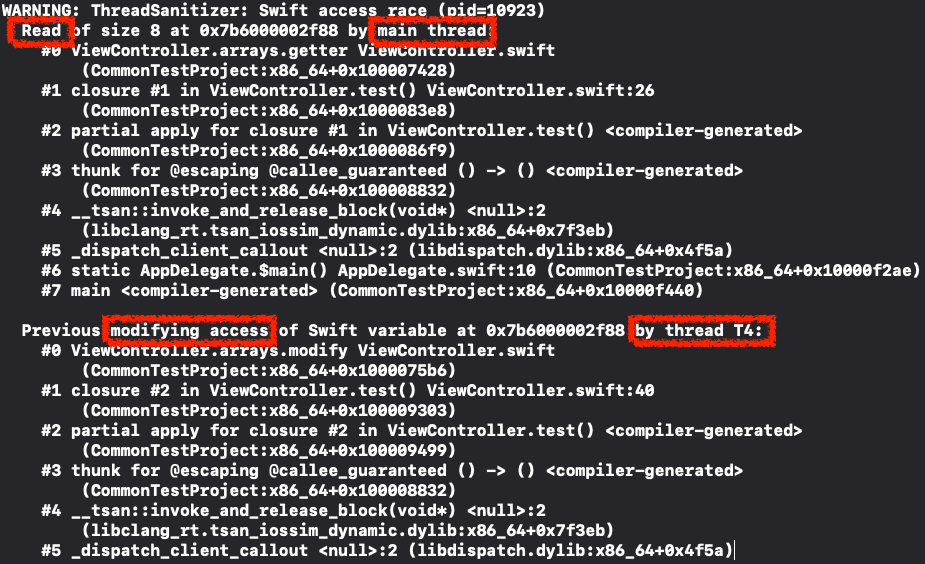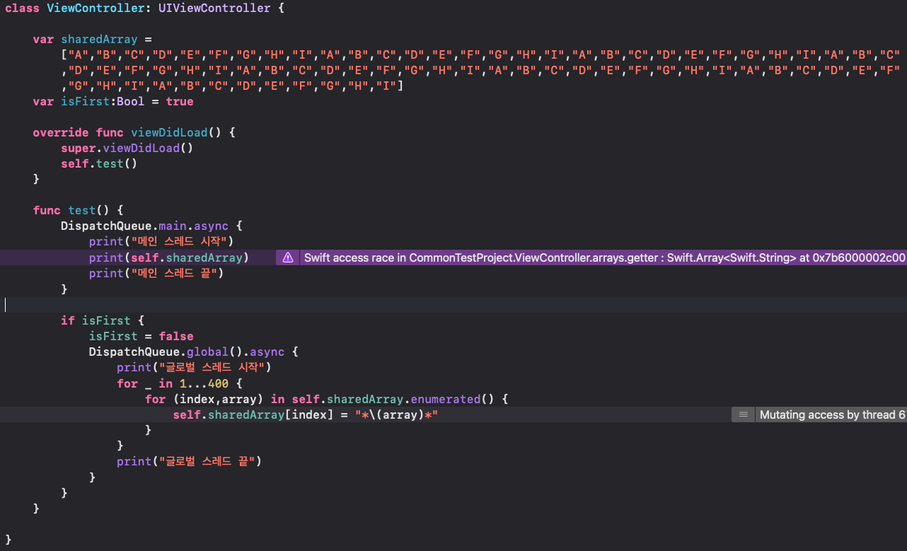 3. 즉, 하나의 자원을 동시에 읽고 쓰기 때문에 Thread Sanitizer가 Swift access race in... 오류가 나타났습니다.